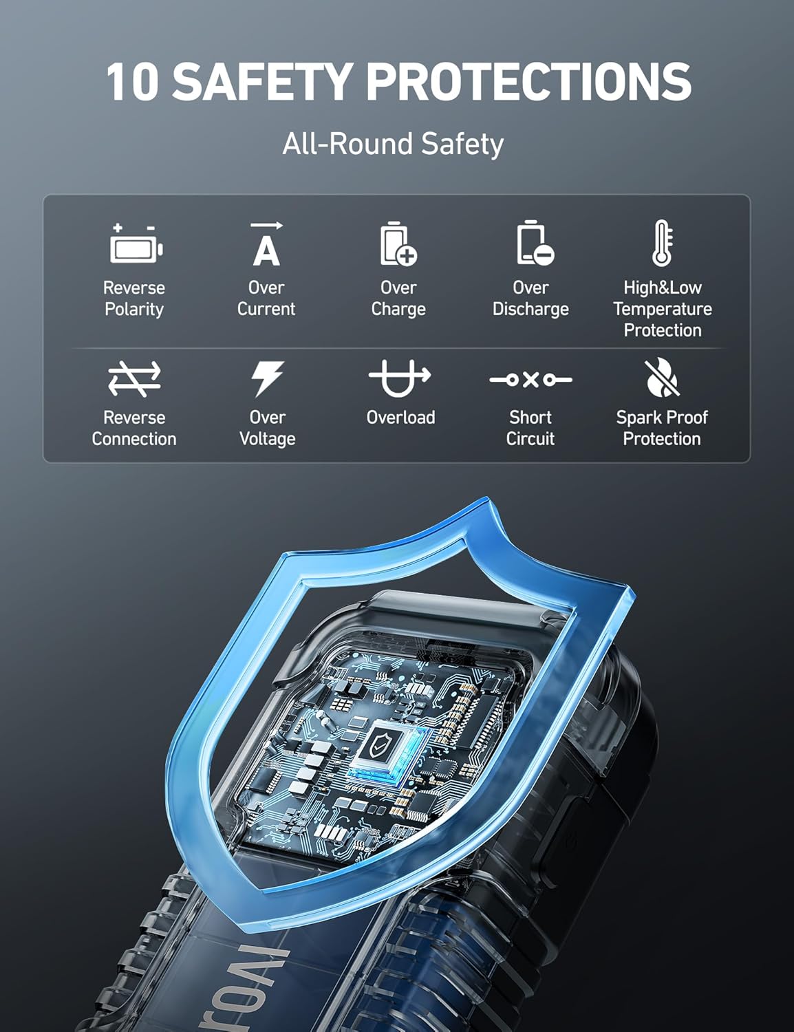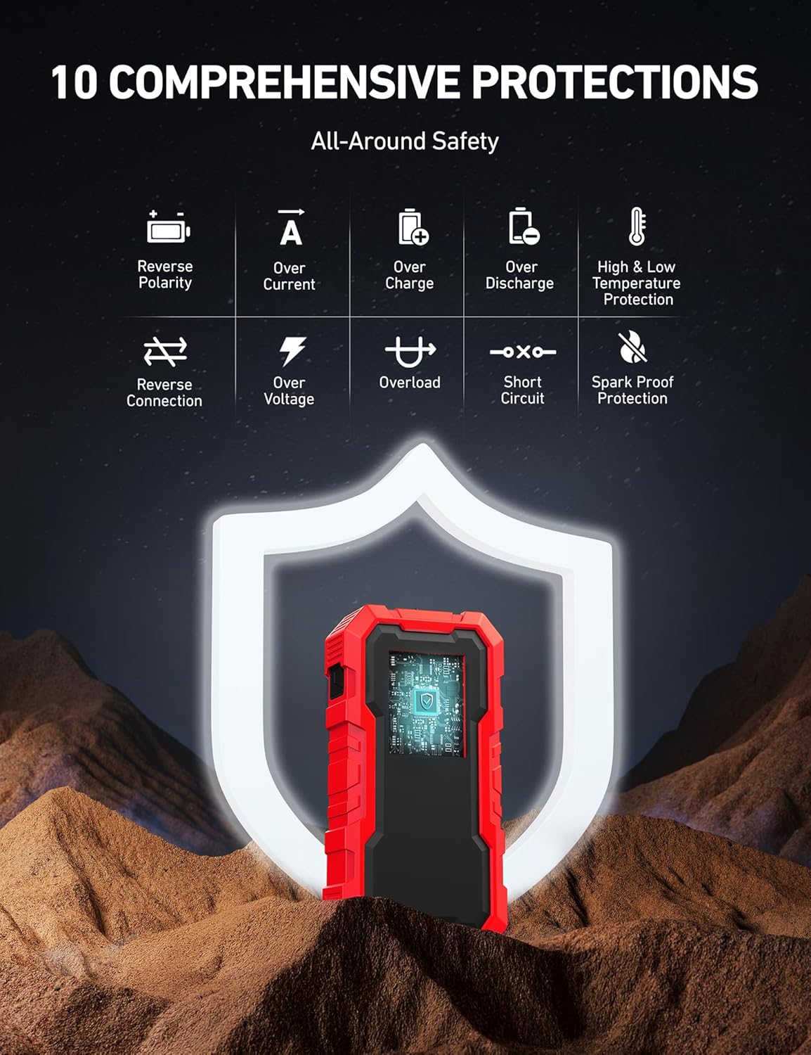 - COMPREHENSIVE SAFETY - This portable battery jumper starter has 8 integrated protections including reverse polarity, reverse connection, overcurrent, overvoltage, overload, overcharge, over discharge, and short circuit protection. Ensure your trip is safe and smooth.