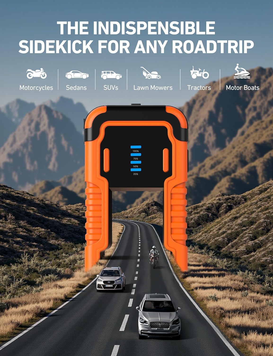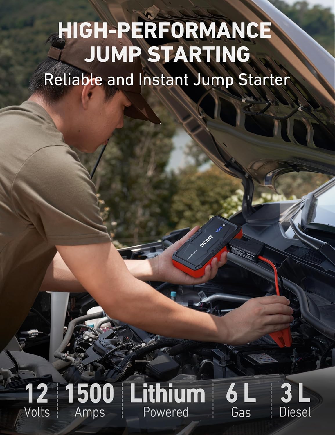 - HIGH-PERFORMANCE JUMP STARTING - The car jumper starter portable pack has a 45C high-rate lithium battery and 37WH capacity that can start 6.0 L gas/3.0 L diesel engines and other 12 V vehicles like motorcycles, cars, SUVs, pickups, or lawnmowers.This jump starter's powerful 1500 A peak suit current quickly starts low-voltage and fully-drained batteries, stocking stuffers for men and women.