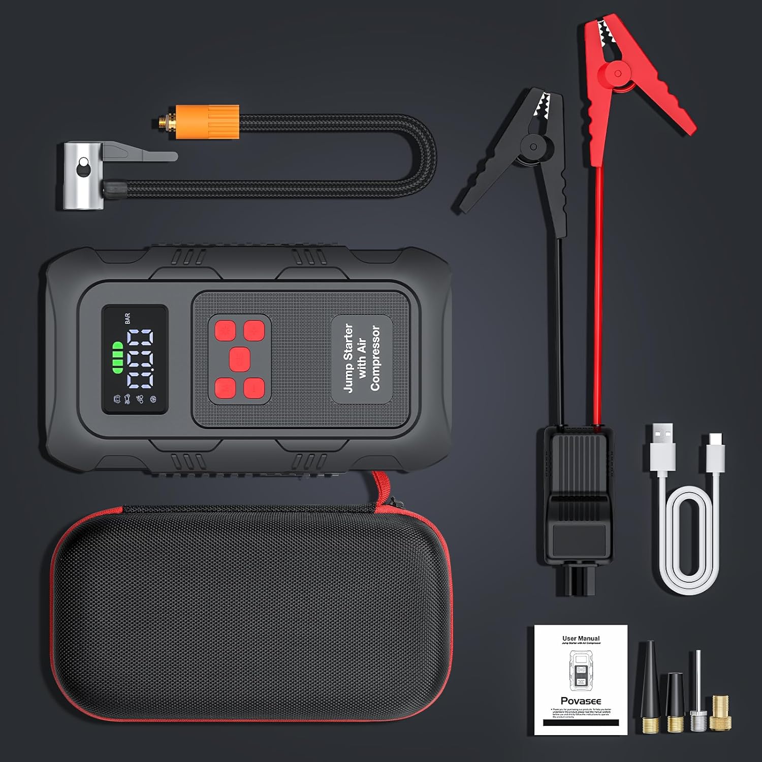 - 【Multifunctional Car Jump Starter】This jump starter box can be used as a mobile power bank (Input:18W Type-C, Output:USB 5V 2.4A, USB 5V/9V/12V Quick Charge) LED flashlight with 3 modes( flashlight, SOS, strobe). to help you in the dark or in emergencies.