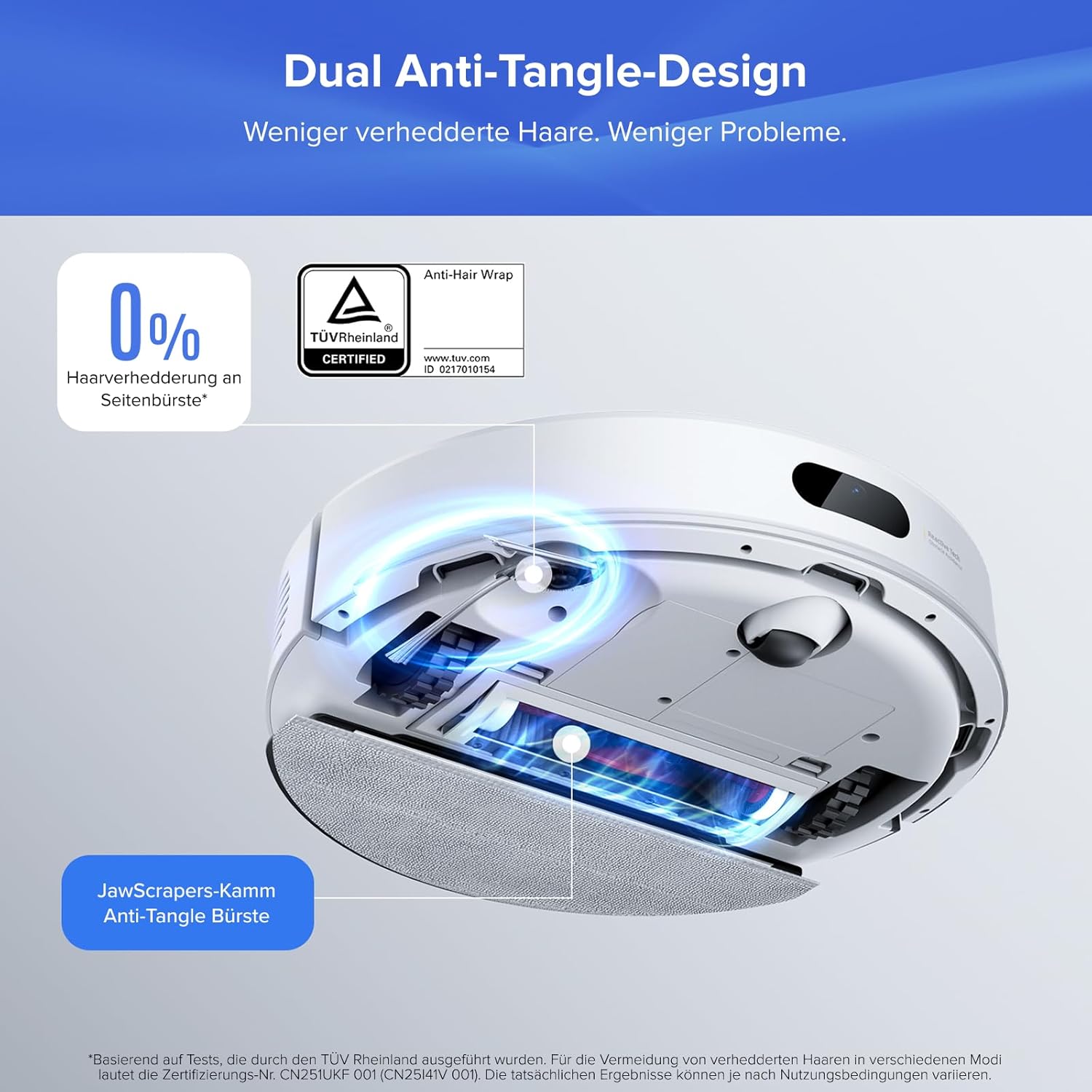 - Leistungsstarke 8.000 Pa Saugkraft für Tiefenreinigung: Mit branchenführender HyperForce Saugkraft von 8.000 Pa entfernt dieser staubsauger roboter mühelos Schmutz, Rückstände und Tierhaare aus Teppichen und Hartböden. Die smarte Ausrichtung des Pfads verbessert die Fugenreinigung und verringert gleichzeitig den Lärm durch die Reibung der Bürste.