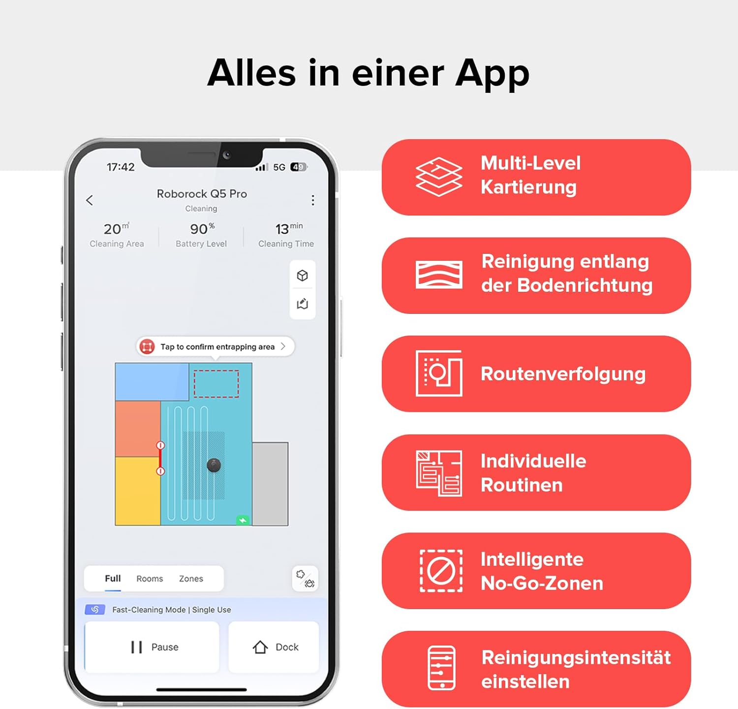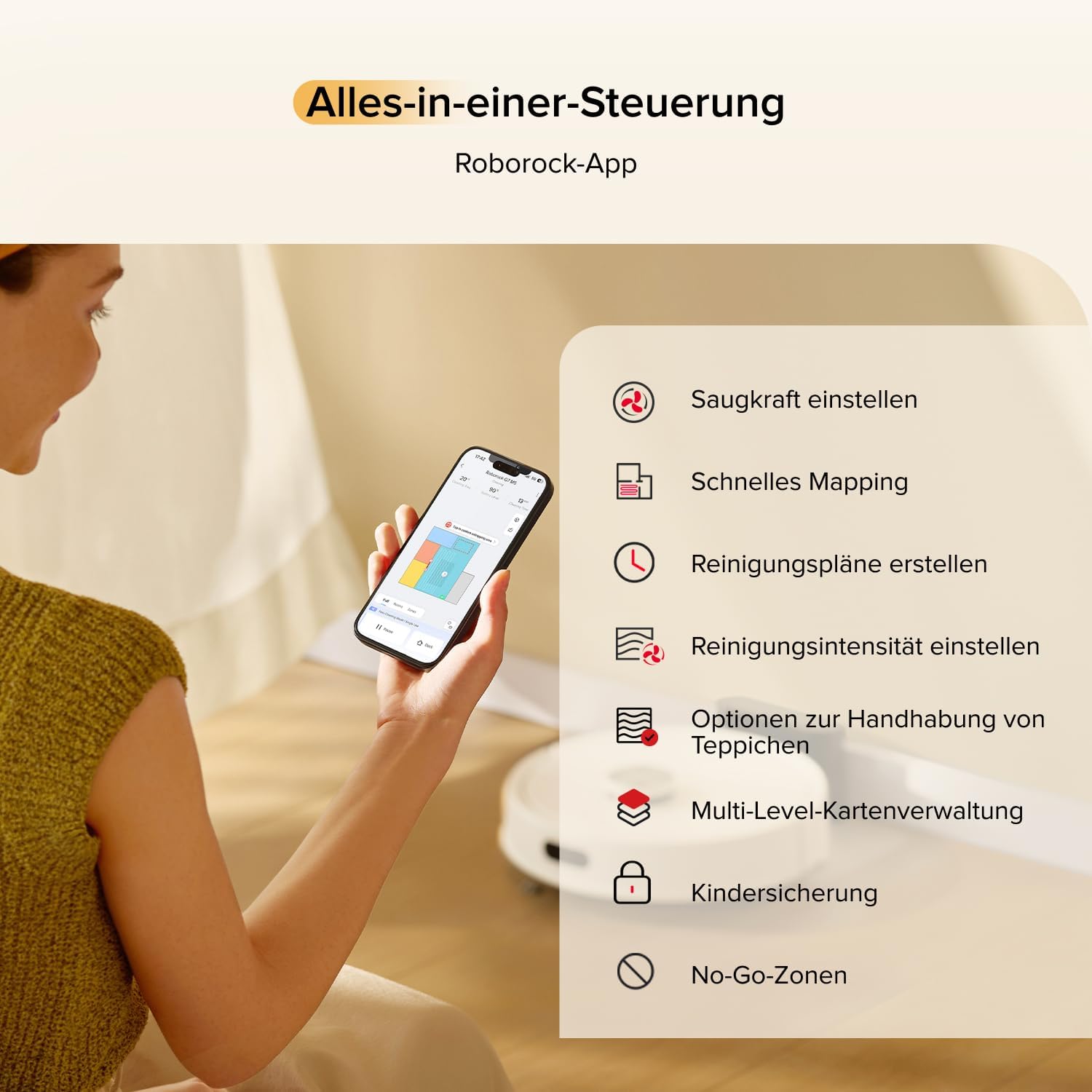 - Smart APP: Über die Roborock-App können Sie mühelos Zeitpläne festlegen, die Saugleistung anpassen sowie No-Go-Zonen und Wischstufen einstellen und machen so Smart-Home-Living wirklich zugänglich. Verbindet sich mit Amazon Alexa, Google Home und Apple Siri für einfache Bedienung.