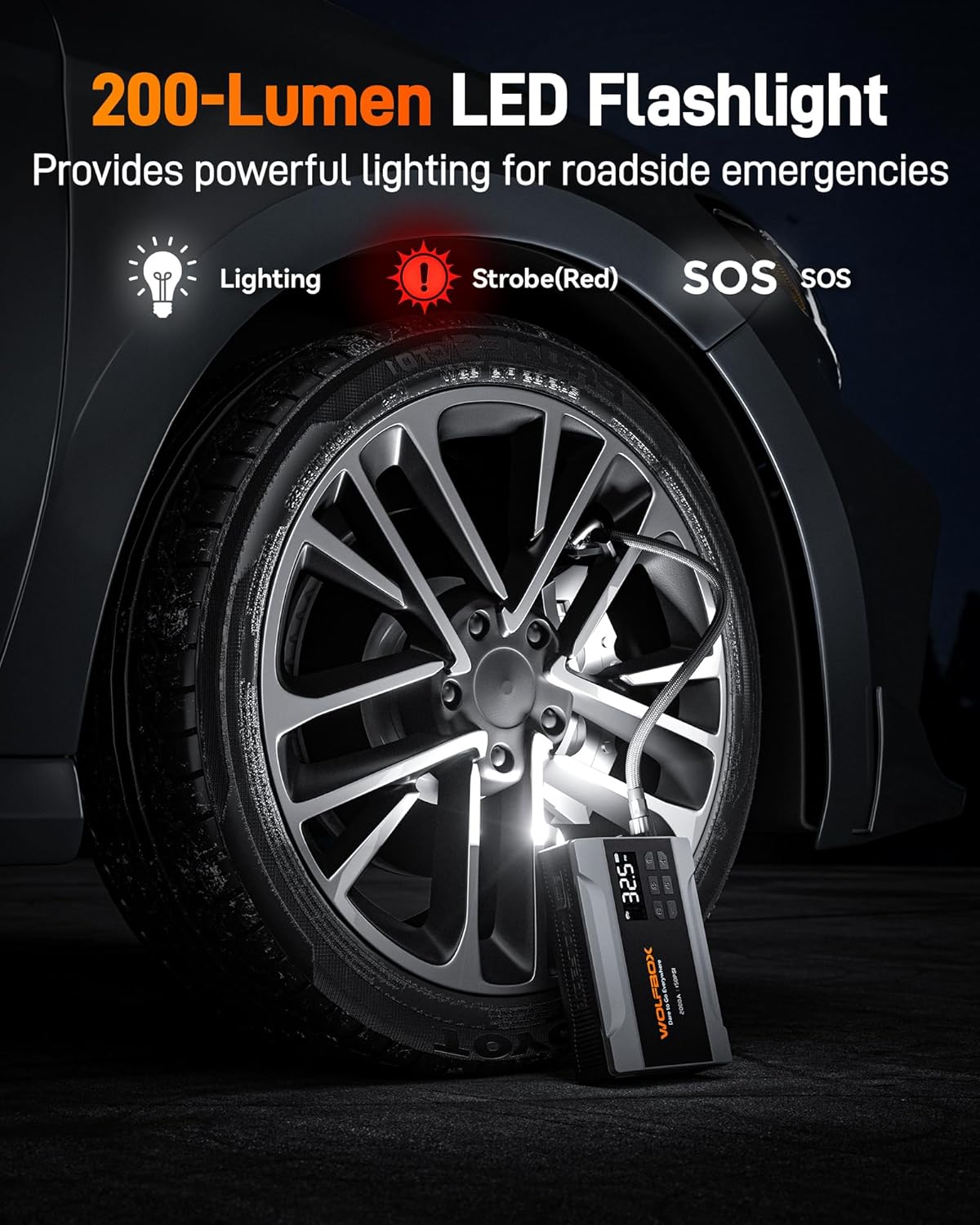 WOLFBOX 4000A Jump Starter with 160PSI Air Compressor, 12V Car Battery Booster, 65W Fast Charge, 24000mAh Portable Tire Inflator, LED Display for 10L Gas & 10L Diesel Engines, LED Light, Jumper Cables
